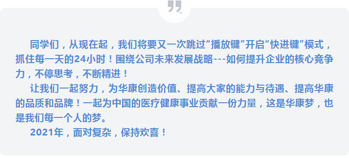 开局即冲刺!2021年,华康世纪将紧紧把握医疗行业发展的机遇,充分运用近年来高质量发展打下的良好基础,依托华康世纪供应链优势,以改革创新的思维、华康人在实践中孕育和形成奋斗不息的精神、脚踏实地的作风,为全面实现年度各项工作目标而努力奋斗,为中国的医疗健康事业贡献一份力量!