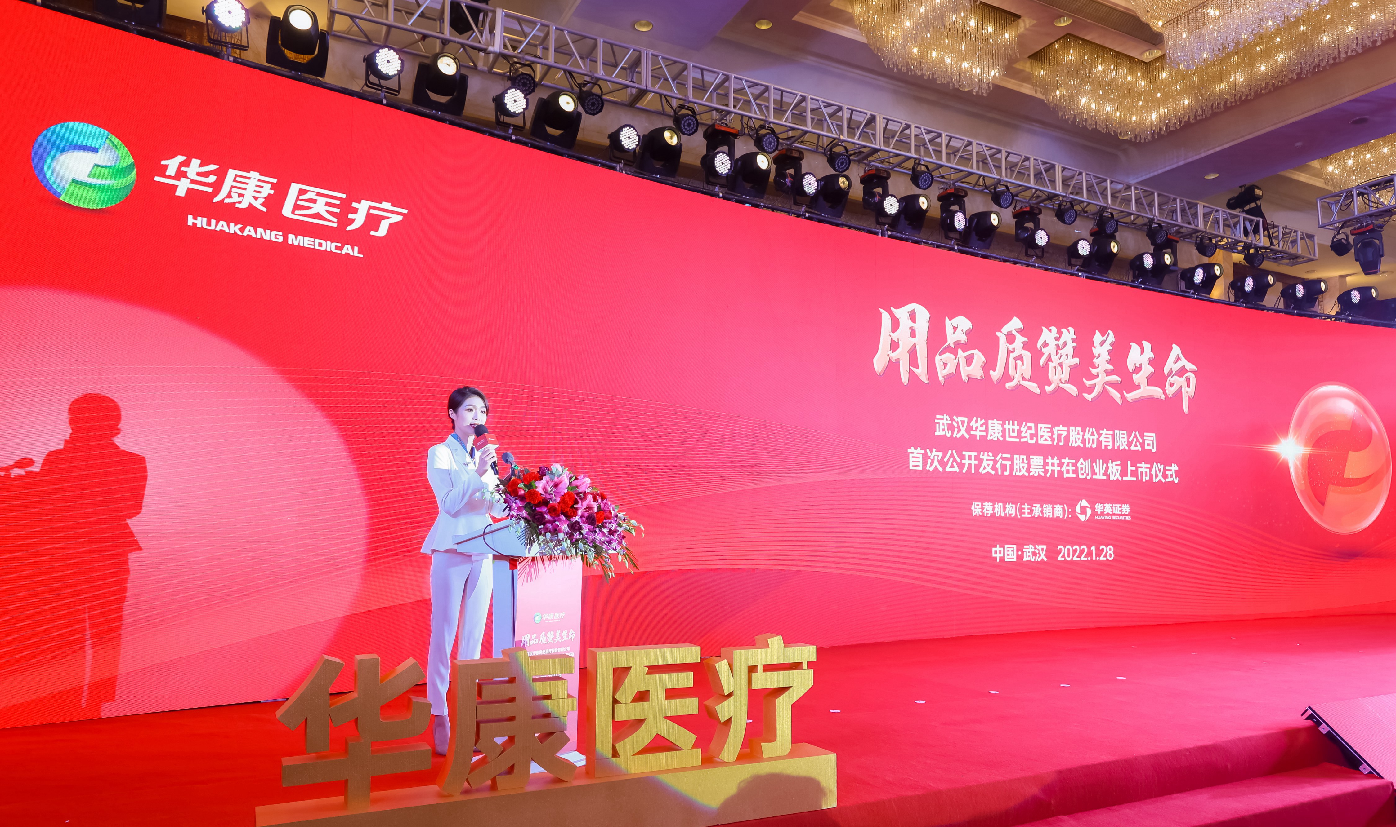 【概要描述】2022年1月28日,武汉华康世纪医疗股份有限公司(股票简称:华康医疗,股票代码:301235)成功登陆深圳证券交易所创业板正式挂牌上市。 按照新冠肺炎疫情防控要求,今天华康医疗的上市仪式在湖北省武汉市举办。 上午9时30分,随着湖北省政府办公厅二级巡视员林竹青,武汉市委常委、东湖高新区工委书记、管委会主任刘洁,湖北省武汉市人民政府副市长赵峰,湖北省孝感市云梦县县委书记高文峰,华英证券有限责任公司总裁王世平,华康医疗董事长谭平涛共同敲响鸣锣开市的钟声,华康医疗正式登陆深圳证券交易所。 政府领导、投资机构、业界同仁、合作伙伴等出席本次活动,与华康医疗共同见证这历史性的时刻,分享这份喜悦和荣耀! 现场,深圳证券交易所委托湖北省地方金融监督管理局副局长严宓向华康医疗赠送上市纪念品表示祝贺,华康医疗董事会秘书谭咏薇、财务总监张英超共同上台接受上市贺礼。 华康医疗董事长谭平涛分享,上市对于华康医疗来说意味着更大的责任与担当,站在新的历史起点,华康医疗将坚定信念、专注主业,秉承“用品质赞美生命”的企业使命,不断完善自我,践行合作共赢发展理念,引领行业发展,稳扎稳打,做长期有价值的事,成为一家优秀并回馈社会的企业。 湖北省孝感市云梦县县委书记高文峰致辞,向华康医疗表示热烈的祝贺!公司创始人谭总作为云梦籍企业家,在2020年支持云梦打赢疫情防控攻坚战中,与家乡人民心连心共患难,慷慨解囊,在关键时候彰显了一名企业家的责任和担当。华康医疗全资子公司湖北菲戈特落户云梦,为家乡的发展注入了生机与活力,下一步我们将为企业提供贴心服务,与企业同频共振,互利共赢。 武汉市委常委,东湖高新区工委书记、管委会主任刘洁,在致辞中表示,向华康医疗的成功上市表示衷心的祝贺,华康医疗作为光谷生命健康产业领域的明星企业,抗击疫情的代表企业,迎来了成功上市的重要时刻,这是奋力拼搏、协同创新的重要结晶,希望华康医疗以上市为新的起点,再接再厉、再攀高峰,加快建成全球顶尖的医疗计划服务领军企业,持续为东湖科学城的建设聚力赋能。 东湖高新区也将进一步服务好、保障好华康医疗的创新发展,全面优化提升发展环境,做好服务企业的“店小二”,更大力度支持企业立足光谷,服务全国,走向世界。 新征程,行稳致远。此次上市,标志着华康医疗进入新的发展阶段;未来,华康医疗将紧跟国家战略,全面提升公司战略统筹,坚守高质量发展主线,稳扎稳打,做长期有价值的事。 感谢社会各界朋友及合作伙伴对华康医疗的关注与支持。让我们继续携手,稳步前行,共同迈向更美好的未来!