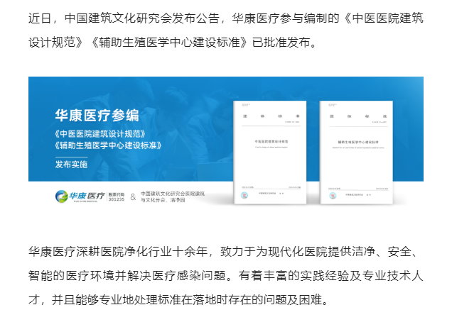 【概要描述】近日,中国建筑文化研究会发布公告,华康医疗参与编制的《中医医院建筑设计规范》《辅助生殖医学中心建设标准》已批准发布。 华康医疗深耕医疗净化领域,跟踪行业技术前沿,在技术专利及工艺专利方面不断形成自我特色,先后参与了30项行业标准、规范等文献编制。