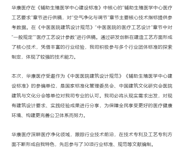 华康医疗深耕医疗净化领域,跟踪行业技术前沿,在技术专利及工艺专利方面不断形成自我特色,先后参与了30项行业标准、规范等文献编制。