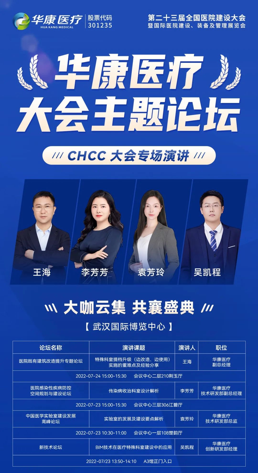 华康医疗作为CHCC大会战略合作伙伴,将参与《医院既有建筑改造提升专题论坛》《医院感染性疾病防控空间规划与建设论坛》《中国医学实验室建设发展高峰论坛》《新技术论坛》,为大家带来《传染病收治科室设计解析》的课题分享,更有现阶段各大医院改造升级所面对的问题,我们结合实践经验进行《特殊科室提档升级(边改造、边使用)实施的重难点及经验分享》《实验室的发展及建设要点解析》《BIM技术在医疗特殊科室建设中的应用》等课题的精彩分享。诚邀各界朋友莅临参加与见证。