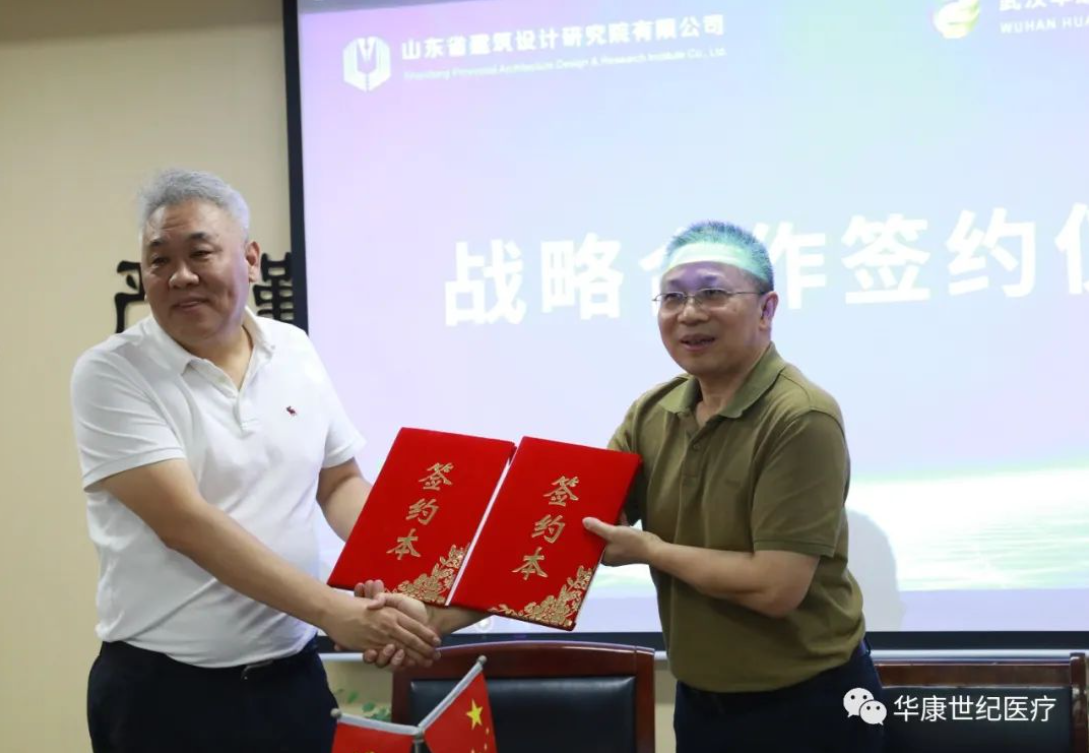 为发挥各自优势,形成良好合作,武汉华康世纪医疗股份有限公司与山东省建筑设计研究院有限公司医养建筑研究院达成友好战略合作关系,2022年7月21日,双方代表在华康医疗总部九楼会议室签订框架合作协议,签约仪式由华康医疗技术研发中心副总经理李芳芳主持,华康医疗董事长谭平涛、总经理谢新强,山东省建筑设计研究院有限公司总经理王宝峰,山东省建筑设计研究院有限公司副总经理、医养建筑研究院院长李鹏出席签约仪式。