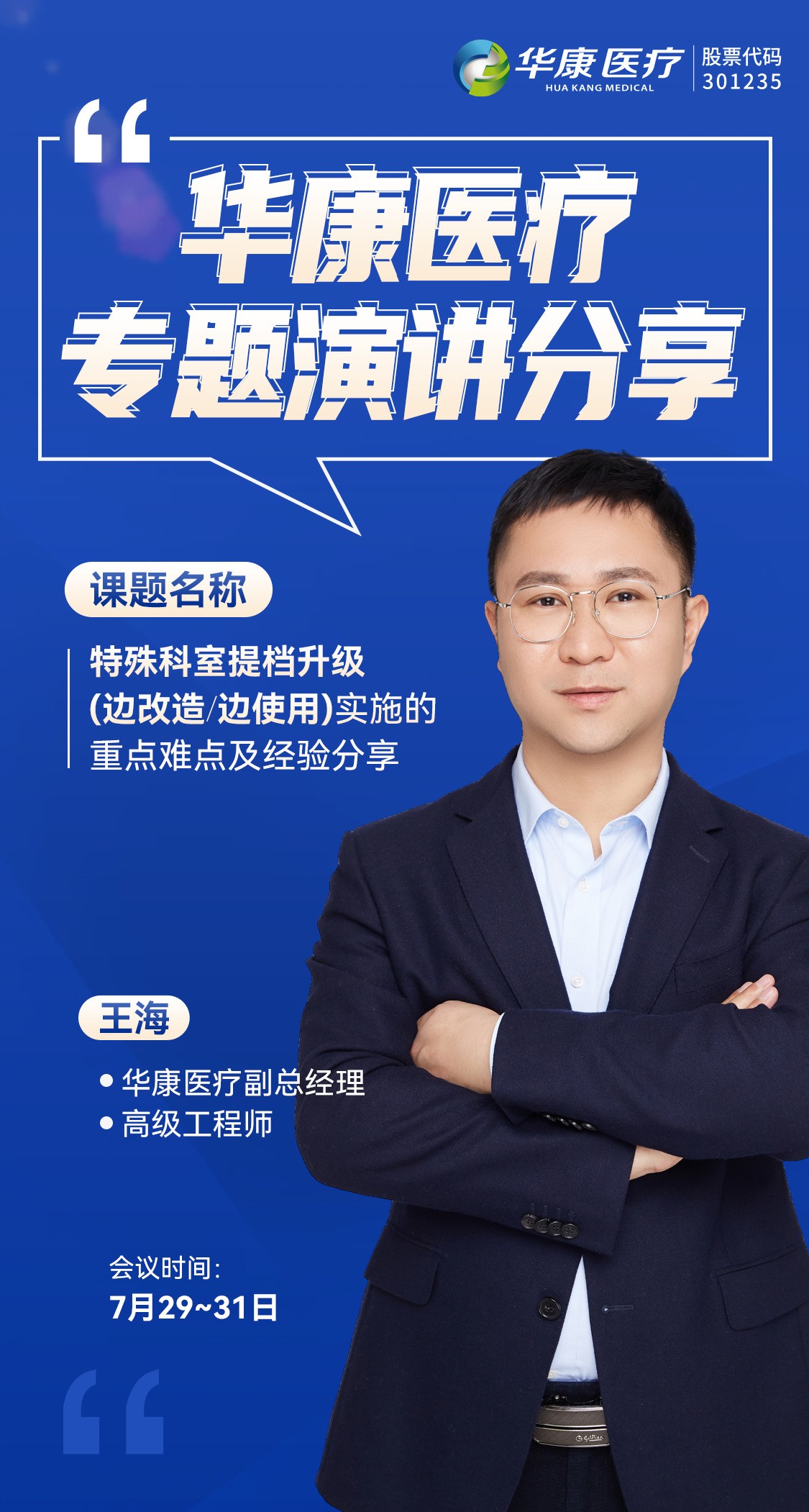 华康医疗是以医疗净化为主业的创业板上市公司(股票代码:301235),致力于解决医院感染防控问题,为医疗机构提供医疗净化系统设计,实施和运维一体化解决方案。作为大会支持单位,华康医疗将全程参与“智慧·体验·赋能”建设智慧型医疗大健康产业新格局论坛,届时华康医疗副总经理王海将为大家带来《特殊科室提档升级(边改造、边使用)实施的重点难点及经验分享》的专题演讲,共同探讨现代医疗净化领域的新技术、新方案。