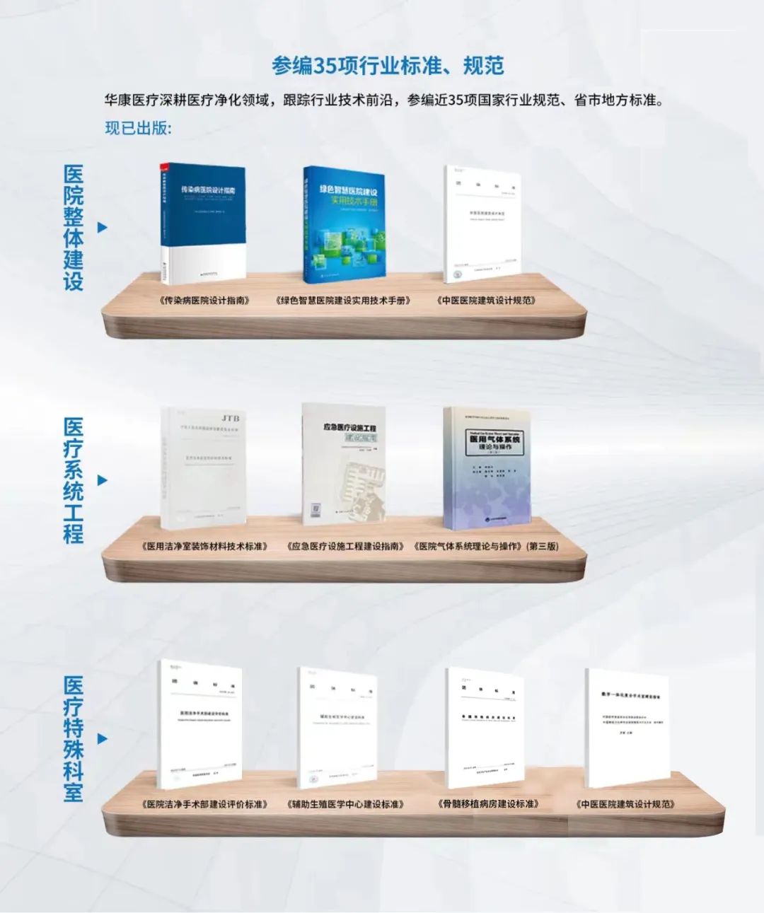 截止目前,华康医疗已主编/参编行业标准及规范35项。今后,华康医疗必将继续深耕净化领域,并与行业分享先进的医院建设经验,带动行业不断高标准高水平向前、向上发展;与专家学者一起,为保障全民享受更好的医疗健康环境、构建更完善的公卫体系而努力。