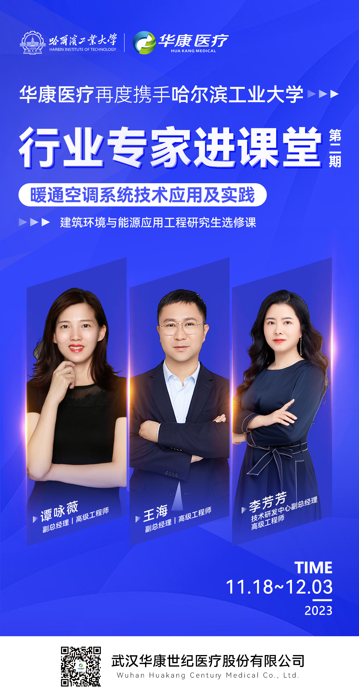 华康医疗作为医疗专项与实验室集成化整体解决方案服务商,与哈尔滨工业大学在人才培养上实行一体推进,一体实施,共生共赢模式,公司三位拥有多年医疗净化行业从业经历的高级工程师谭咏薇、王海和李芳芳受聘为哈尔滨工业大学高水平共建课程教师。在本期课程中,他们将继续秉持专业性与实战性的原则,聚焦新形势下暖通空调技术的发展现状与行业需求变化,全面升级教学模式、教学内容、教学方法,增强创新人才培养的灵活性,让研究生们在基础理论与真实案例的交融中学真知、强本领,扎实推动“产学研用”一体化发展。