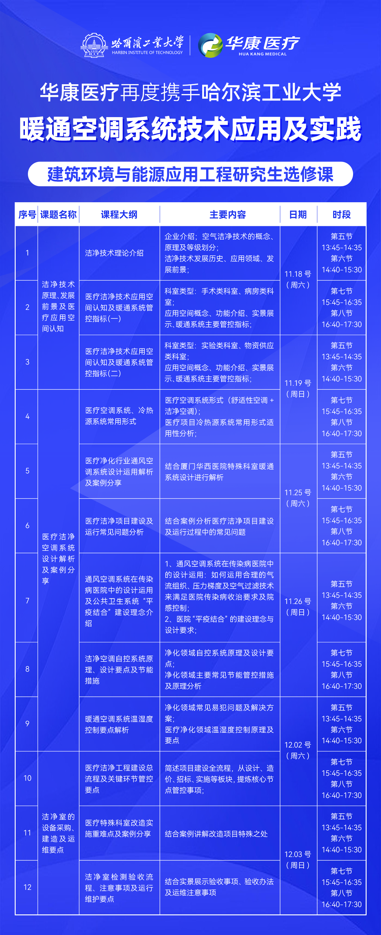本期课程采取线上授课形式,授课时间为2023年11月18日——12月3日,每周六、周日下午各4课时,共计24课时,主要围绕洁净技术原理、发展前景及医疗应用空间认知;医疗洁净空调系统设计解析及案例分享;洁净室的设备采购、建造及运维要点等专业知识进行讲解。
