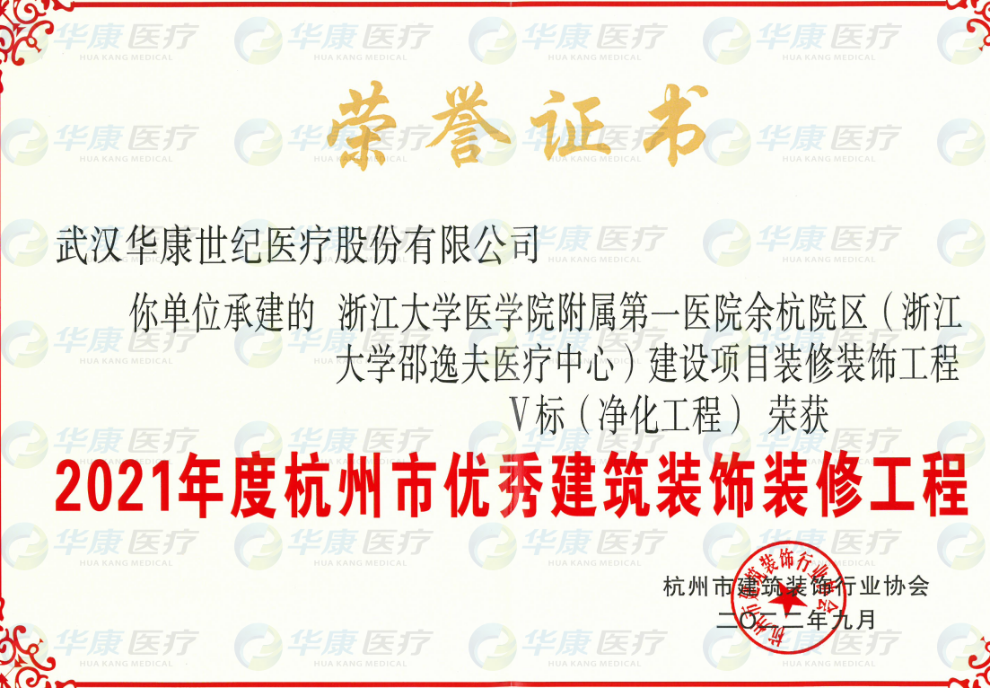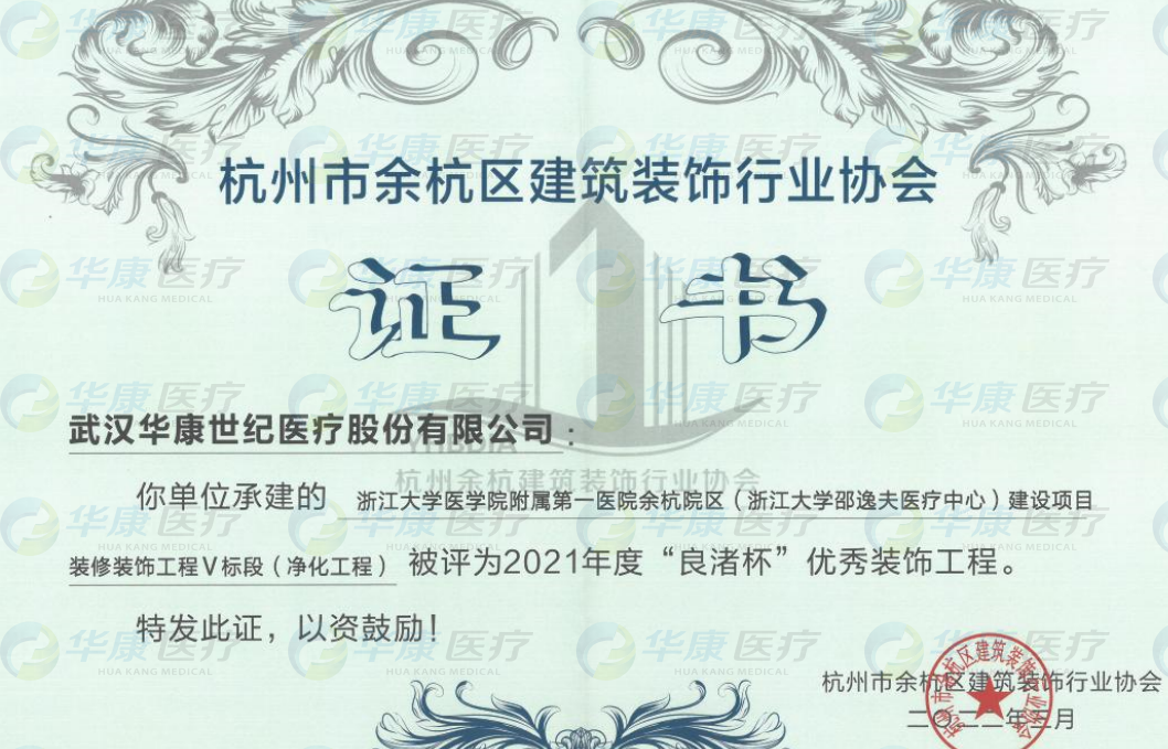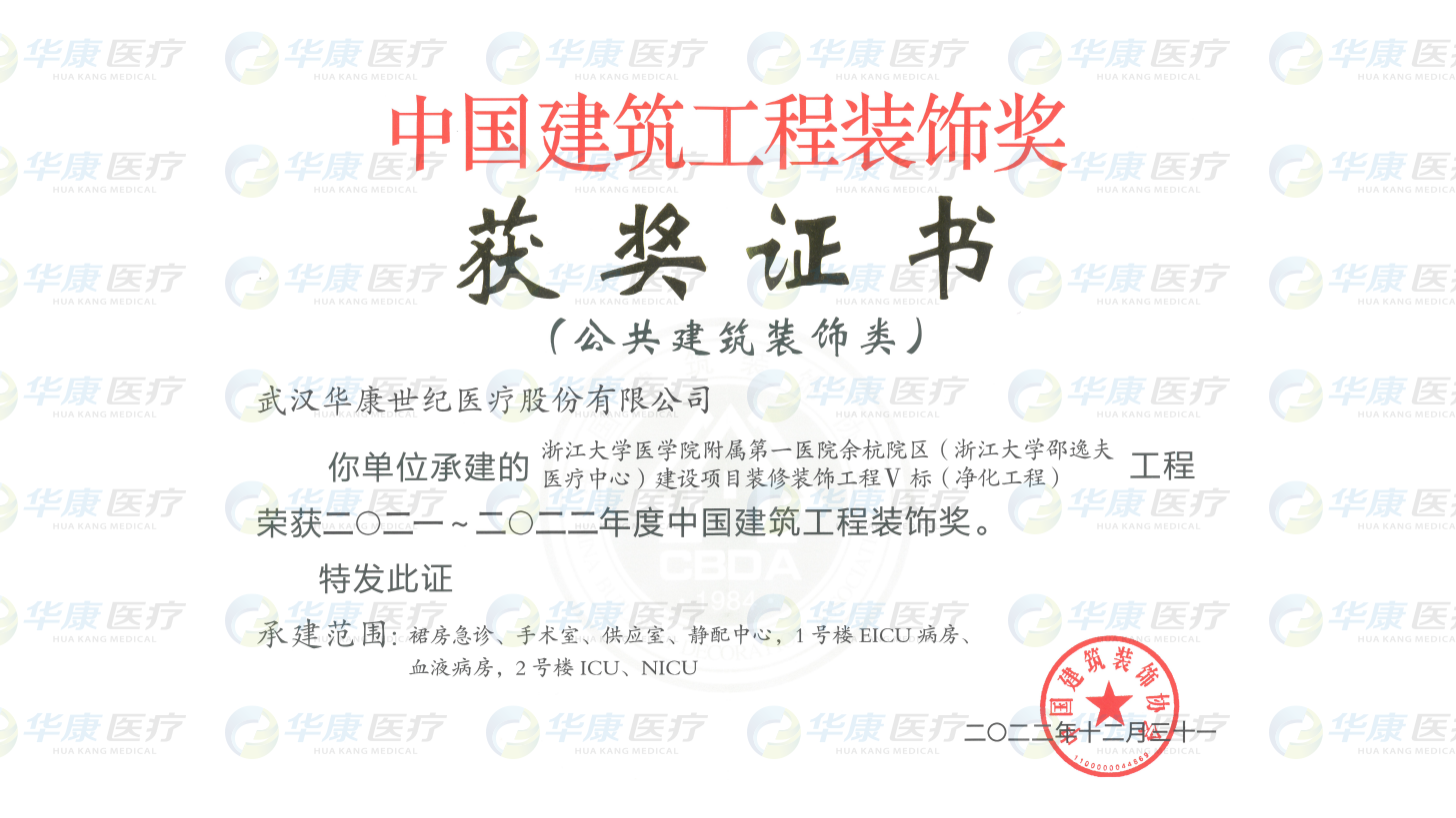 【概要描述】近期,由中国建筑业协会发布的“2022~2023年度第二批中国建设工程鲁班奖(国家优质工程)”工程名单现已公示完毕。华康医疗参建的浙江大学医学院附属第一医院余杭院区(浙江大学邵逸夫医疗中心)特殊科室医疗净化项目喜获中国建设工程鲁班奖!