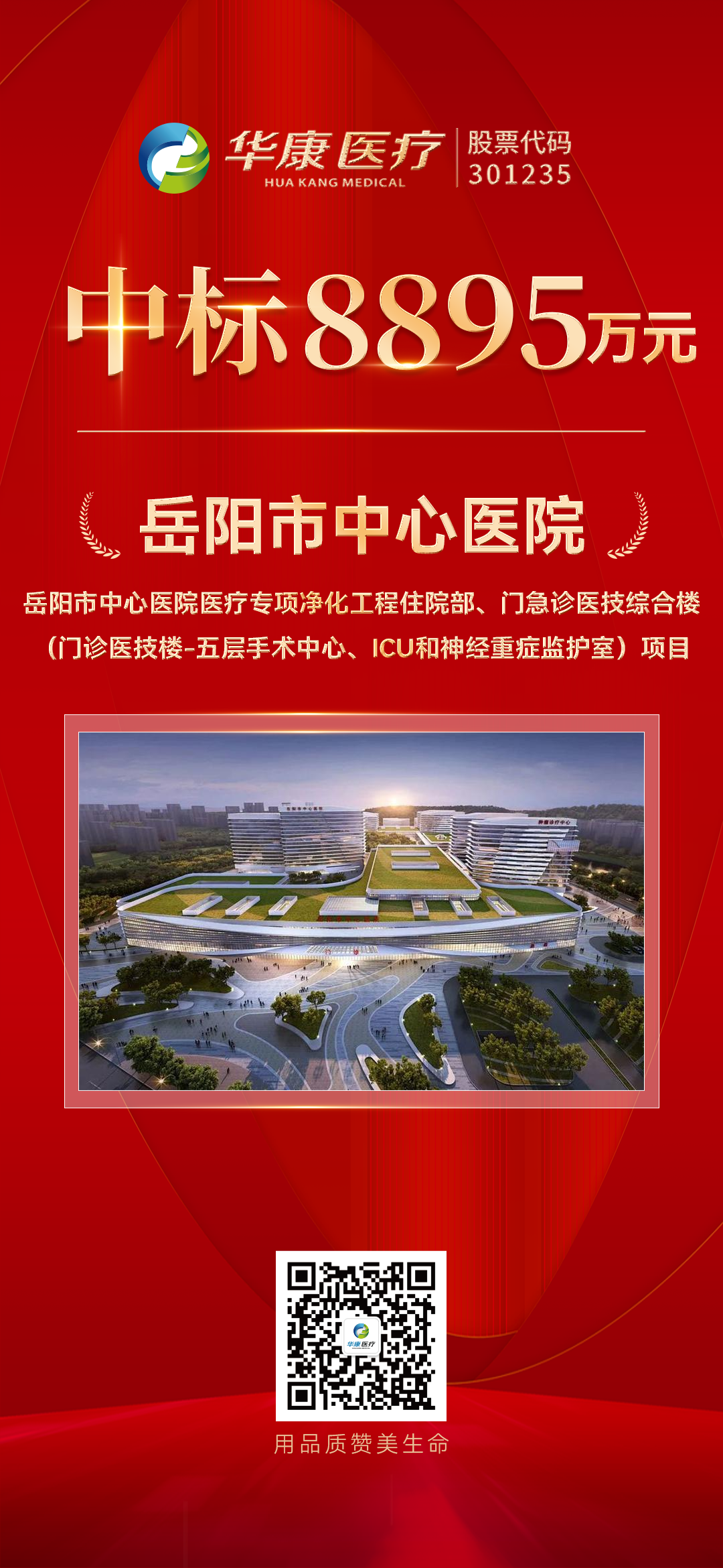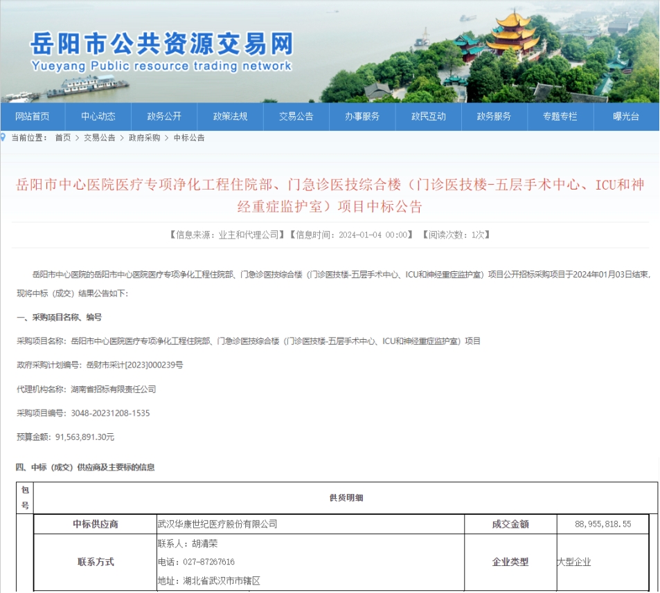 武汉华康世纪医疗股份有限公司于近日参与了“岳阳市中心医院医疗专项净化工程住院部、门急诊医技综合楼(门诊医技楼-五层手术中心、ICU和神经重症监护室)项目”项目投标。经评标委员会评审,并由有关行政监督部门对开标、评审工作全过程进行监督,2024年1月4日,岳阳市公共资源交易网发布了相关中标结果公告,现将具体中标情况提示如下:
