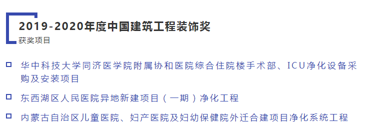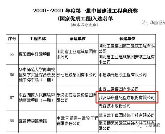 11月30日,中国建筑业协会官网公示了2020~2021年度第一批中国建设工程鲁班奖(国家优质工程),武汉华康世纪医疗股份有限公司参建东西湖区人民医院异地新建项目(一期)净化工程入选鲁班奖。