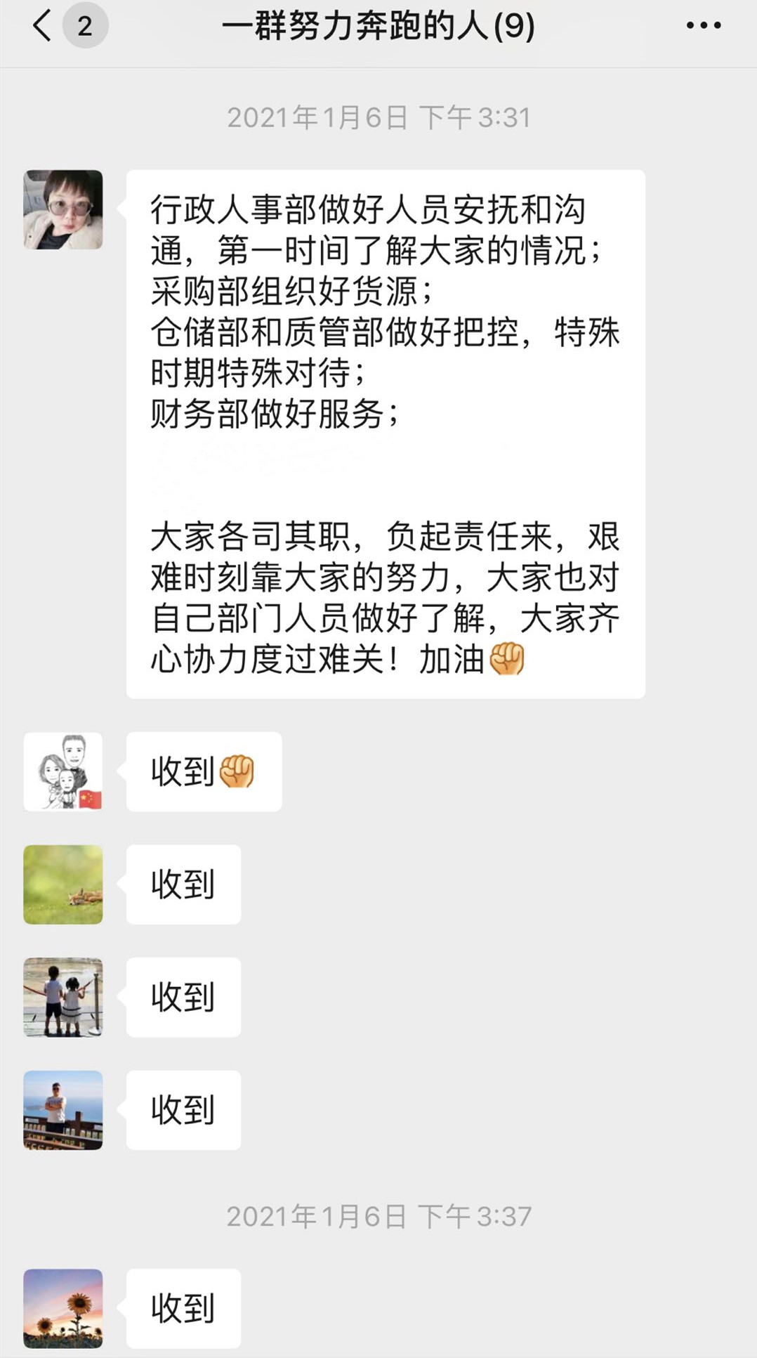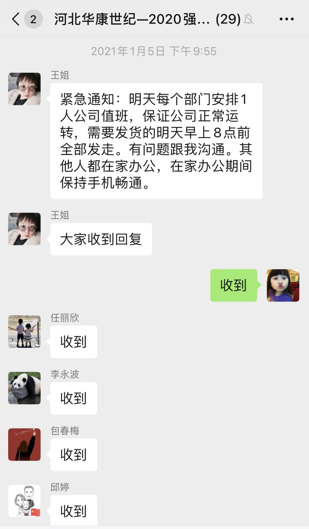【概要描述】2021新年伊始,河北石家庄市、邢台市成为新冠疫情中、高风险地区,河北宣布全省进入战时状态。疫情发生后,习近平总书记作出重要指示,中共河北省委、省政府迅速响应,部署疫情防控工作。 疫情就是命令,防控就是责任。在这场骤然打响的歼灭战中,河北华康世纪医疗科技有限责任公司(华康世纪全资子公司)作为医疗耗材仓储配送企业,第一时间快速响应,充分集合公司力量,迅速投入到这场看不见硝烟的战役之中,为疫情防控物资做好调拨、配送等工作。 线上办公 统一部署 因疫情防控需求,石家庄市所有市民居家隔离。隔离期间,河北华康世纪负责人祝先锋、王晨晨迅速启动线上“云办公”工作模式,组织各部门召开实时会议,针对疫情期间如何确保医疗物资及时抵达进行安排部署。积极为客户开通线上咨询服务、疫情绿色通道等方式,做到防范疫情和优质服务两不误。 客服工作人员,居家隔离后全员在线,全天候24小时不间断提供服务,对客户需求做到第一时间响应、第一时间解决。他们离场不离岗,城市按下暂停键,真诚服务不停歇。 物资配送 驰援医院 寒冬腊月、滴水成冰。河北华康世纪收到某人民医院的医疗物资需求,公司立刻部署,采购部同事多方联系物资,在石家庄、邢台各个区域交通管制情况下,河北华康世纪邯郸区张志存、李文涛肩负起了配送的工作,他们连夜将医疗物资配送到医院。 凌晨3点的河北,气温零下5°,张志存、李文涛一人在车上往下卸货、一人在车下理货,呼出的气立马成了水雾,从凌晨到天亮,直至将医院的库房填满。三天两夜的时间里共配送了一万多套防护服隔离衣及其他防疫物资,得到院方领导的充分认可。 因河北各个物流停运派送,李文涛又驾驶车辆前往各个市区物流点提货,再送到各个医院以确保物资的及时供应。数九寒天,医用物资配送的脚步没有止步。 河北石家庄的突发疫情已经持续了二十多天,河北华康世纪克服物流停运、物资进不了河北等等困难,经过多方协调,以严格把控着产品的质量为前提,及时为各医院提供医用物资的配送。 截止目前,河北华康世纪服务全省多家医院,保证了医疗耗材的配送与供应。并向医院、政府一线等部门捐赠防护服、手消凝液,捐赠还在进行中。 同舟共冀 齐心抗疫 河北华康世纪共克时艰再战疫情 END